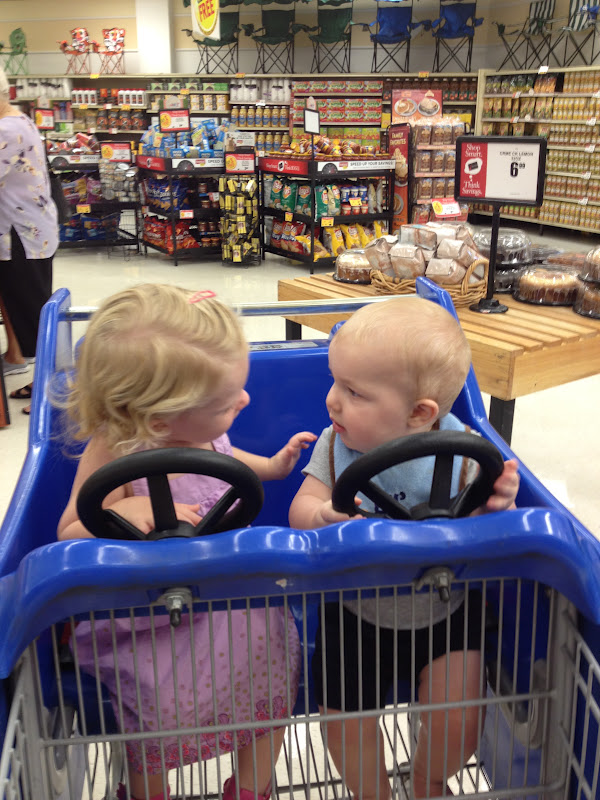 She is such a cutie pie!!  We grabbed breakfast with them and had to make a stop at the grocery store (we forgot Davis' formula - yikes!).  Eloise LOVES the steering component on the buggy so we let Davis try it out as well...I think he liked it too.  Wish they had those at our store...would make shopping much easier!